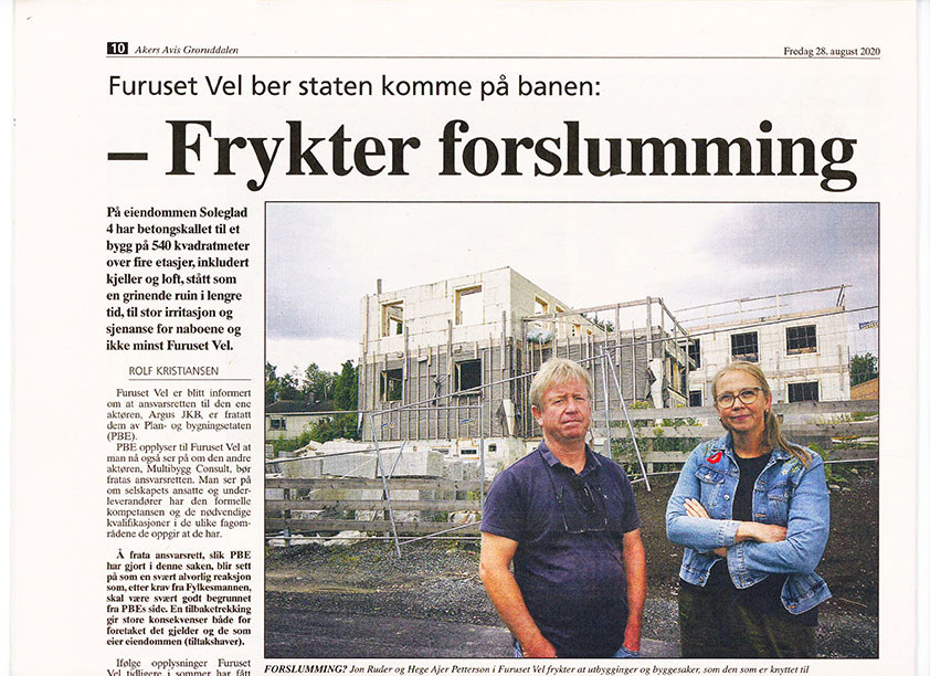 “På eiendommen Soleglad 4 har betongskallet til et bygg på 540 kvadratmeter over fire etasjer, inkludert kjeller og loft, stått som en grinende ruin i lengre tid, til stor irritasjon og sjenanse for naboene og ikke minst Furuset Vel.”